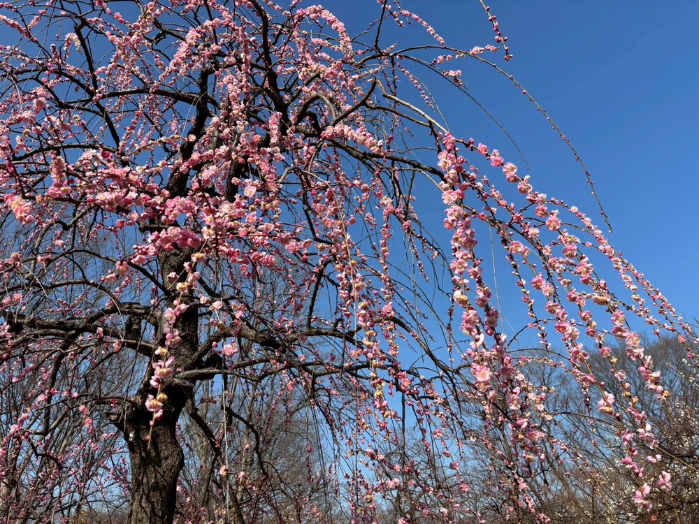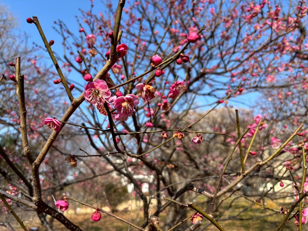 赤、白、ピンク……と、色とりどりの梅があちこちで花を開いている様子は、見ているだけで気持ちが明るくなりますよ。