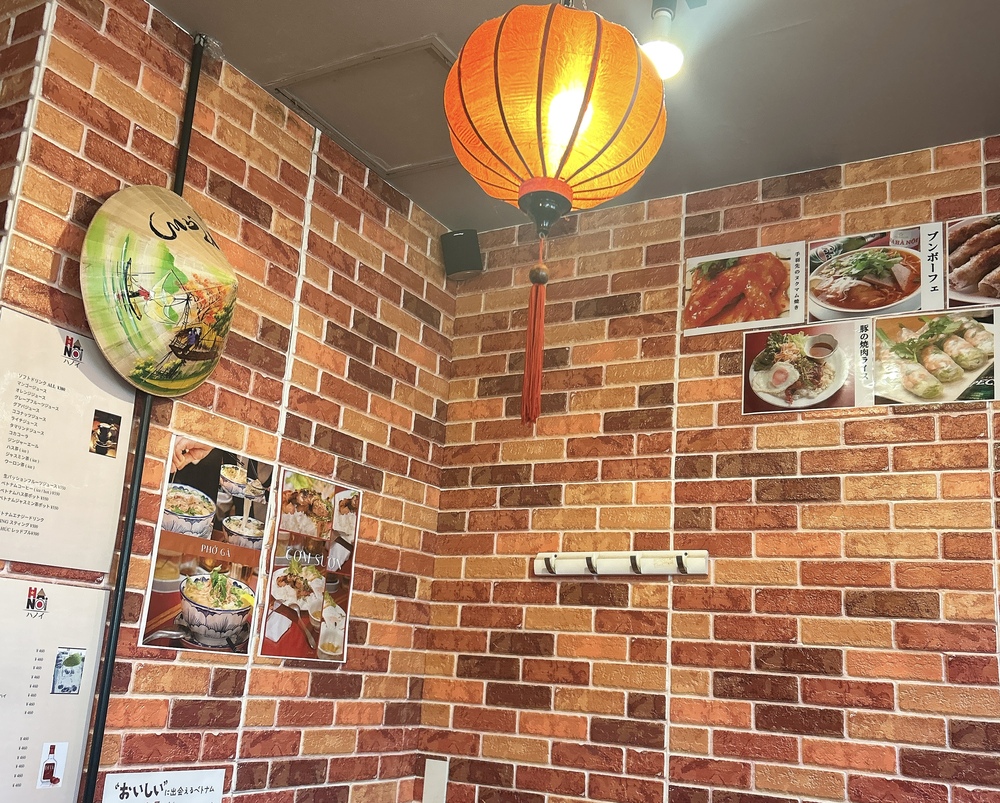 扉をあけると、ベトナムを感じる装飾や色づかいが目に入り、ふわっと異国の雰囲気が広がります。明るすぎず暗すぎない照明、ところどころに飾られたベトナム雑貨にうっとりします。