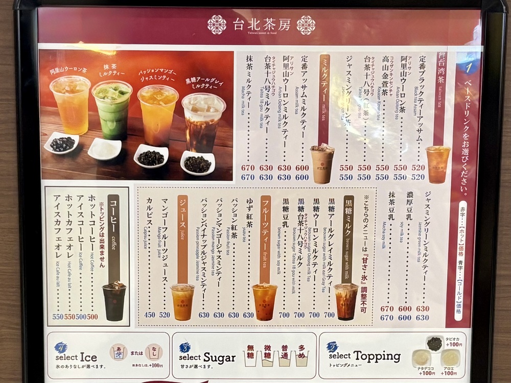 ベースドリンクとして定番の台湾茶は、阿里山ウーロン茶や高山茶など台湾で有名なお茶が勢揃い。ミルクティーはさらに種類が増え、抹茶ミルクティーや抹茶豆乳など、日本の伝統とミックスされたお味も楽しめます。また、南国ならではのフルーツティーや黒糖ミルク、マンゴーフルーツジュースなど、22種類ものドリンクからベースを選ぶことが可能です。
