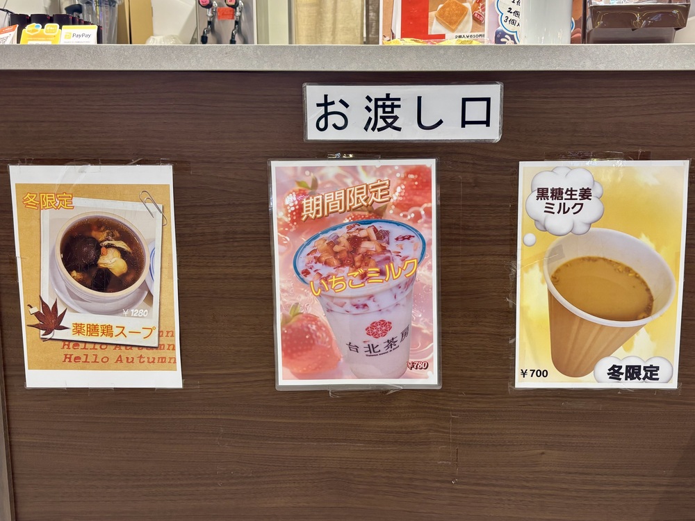 2026年2月に伺った際の期間限定ドリンクは、いちごミルクと黒糖生姜ミルクでした。さらに、冬限定の薬膳鶏スープや肉まん、台湾カステラ(チョコ)のセットもラインナップ。どれもおいしそうで、迷ってしまいますね。