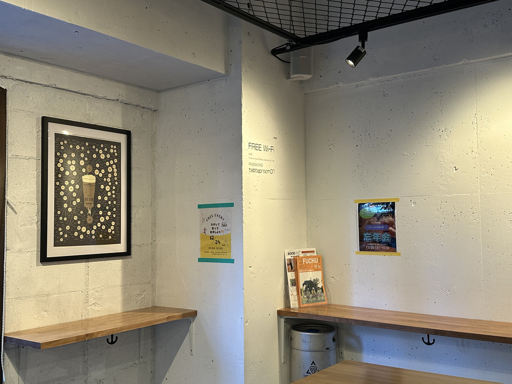 カウンター席からは鹿の角が刺さった印象的なビールタップが並びます。こちらの角を眺めながら飲む一杯も格別です。お洒落で落ち着いた店内で気軽に飲みたい時に重宝すること間違いなし。府中駅での飲み会前に時間が余ってしまった時などの0次会としても活躍しそうです。