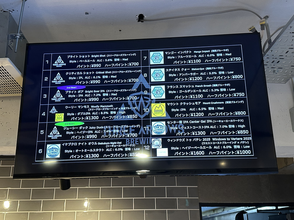 クラフトビールのお店に行ったことがある方なら誰でも一度は面食らうのが英語表記のドリンクメニュー。通常であれば何を頼んで良いのか分からなくなるところですが、スリーアローズブルーイングのメニューはなんとカタカナ表記。