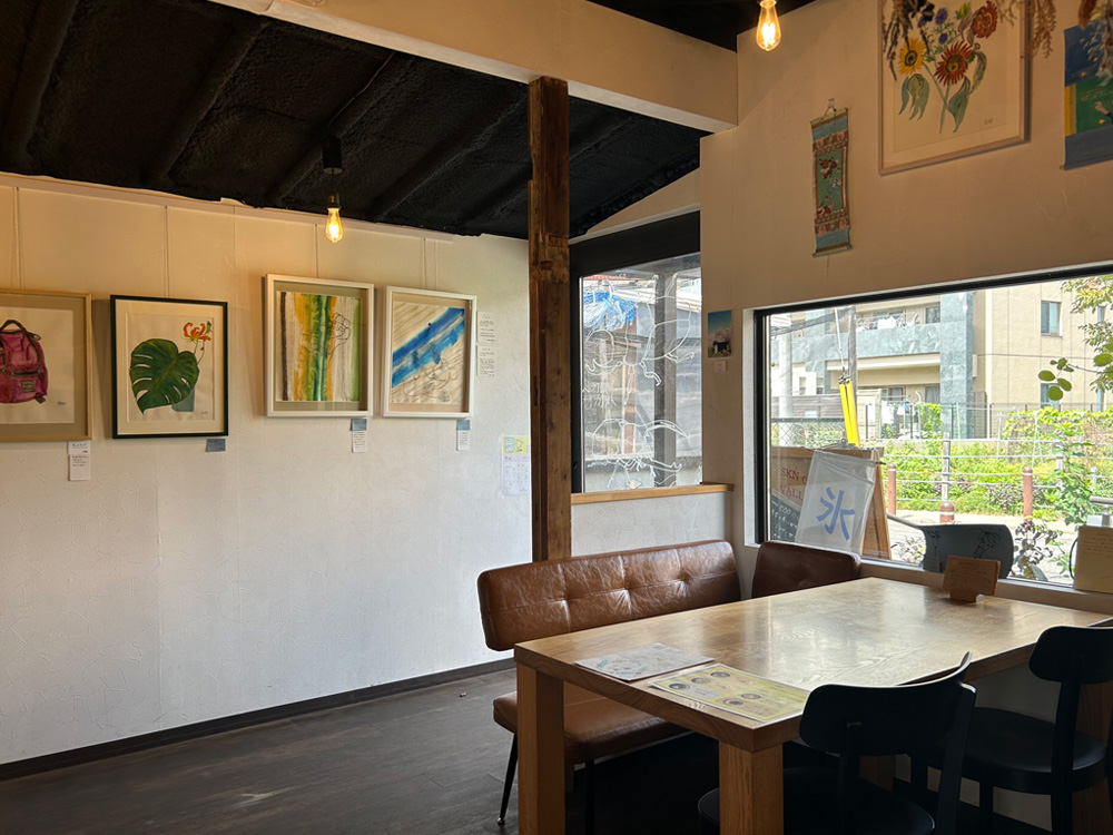 この日の壁には、水彩画・日本画・ワイヤーアートが飾られていて、期間限定の展示会場になっていました。府中で活動されている方々のワークショップなども開催したり、イベントのチラシがあったり、cooは、ひととひとが繋がっていく場でもあるようです……!