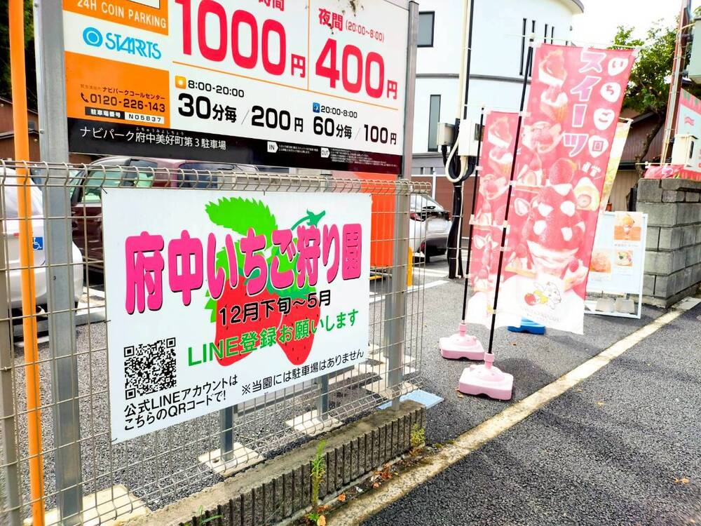 線路を越えてそのまま少し歩くと、やがて視界に飛び込んでくるのは「府中いちご狩り園」の看板 と、スイーツと書かれた赤いのぼり。それがこのお店の目印です。