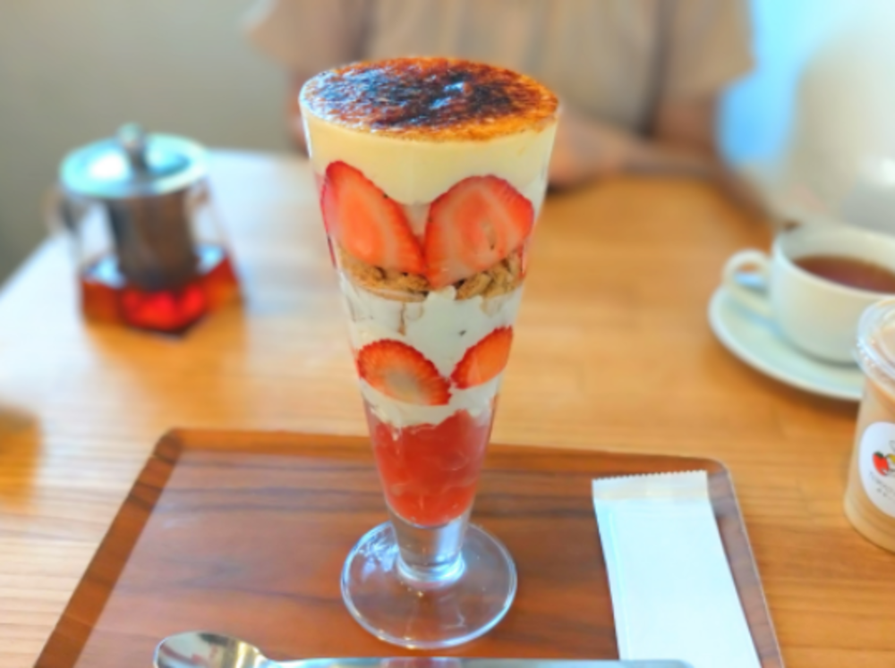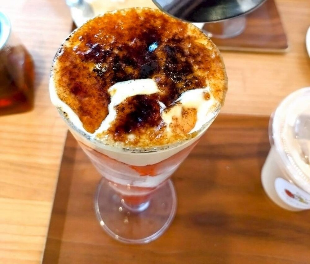 カラメルのほろ苦さと甘いカスタード、バニラアイス、フレッシュないちごが絶妙に調和。食べ進めるとクッキーやジュレで食感も変わり、最後まで楽しめます。いちごとブリュレ、アイス、カスタードを一緒に頬張る瞬間は至福です。