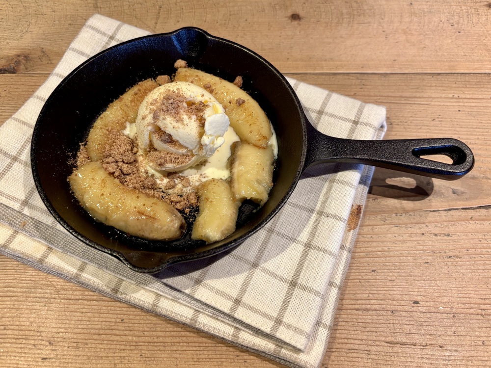 バナナのフォスターとは、アメリカ・ニューオーリンズ発祥のバナナを使用したデザートです。バナナをバター・ブラウンシュガーなどでソテーし、バニラアイスをのせた優しい甘さのスイーツで、とってもおいしかったです。