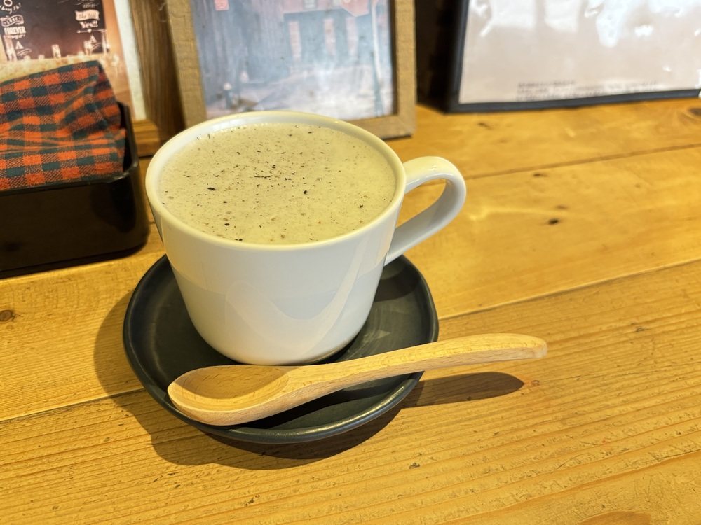 黒ごまラテは、ふわふわのミルクフォームとごまの風味をしっかり楽しめました。木製のスプーンがかわいいですね。食器にもこだわりが光っていて、おしゃれな店内と合わせて写真映えもバッチリです。