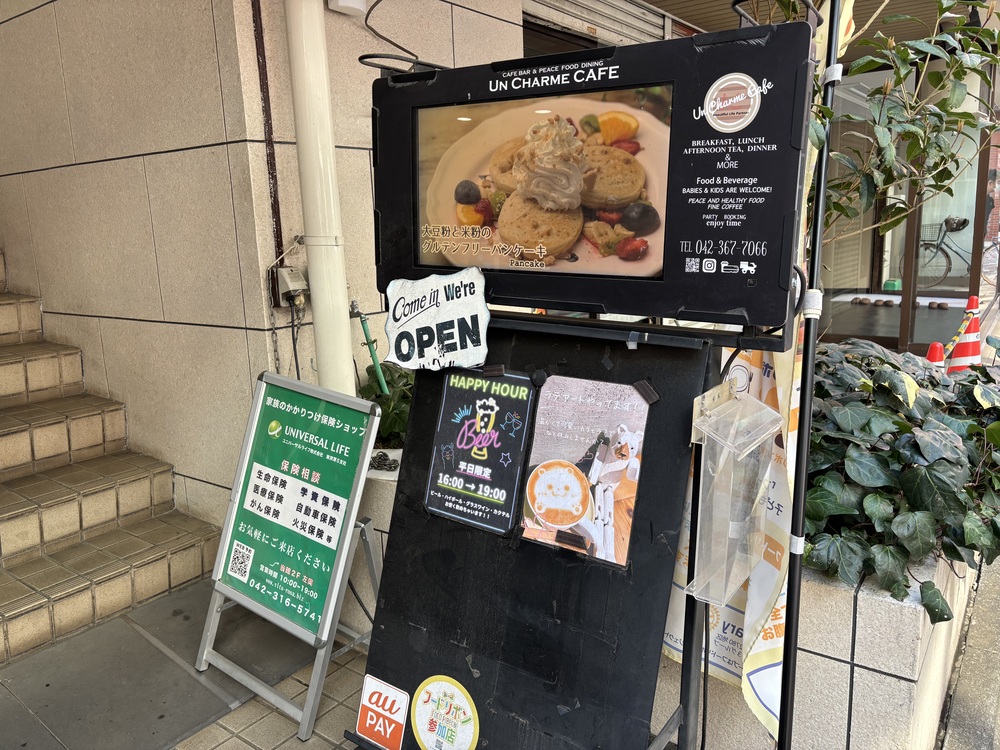 看板の上部は液晶モニターになっていて、おすすめのメニューが順々に映し出されています。初めて訪れる人や、おしゃれな外観のカフェは気後れしてしまって少し入りづらい……という人も、気軽に訪ねやすいですね♪