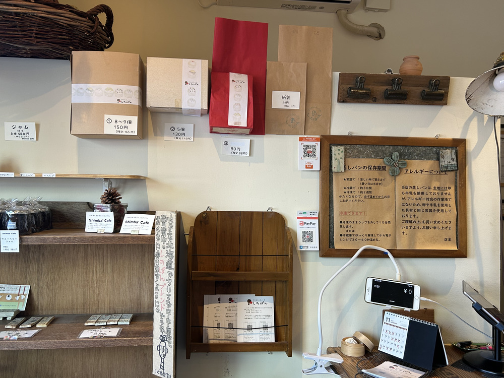 レジの横にはお持ち帰り用の箱や袋も飾られています。差し入れや手土産などに利用しても喜んでもらえそうですね!店内には焼き菓子やジャムも売られているのでセットにしてプレゼントにも喜ばれそうです。