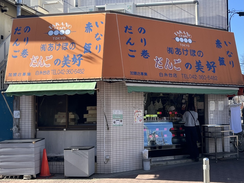 京王線武蔵野台駅から歩いて約2分。のんびりとした時間が流れる通りで、ひときわ目を引くのが、オレンジ色の鮮やかな看板の「だんごの美好 白糸台店」です。