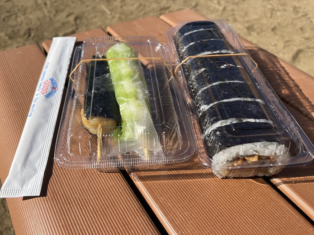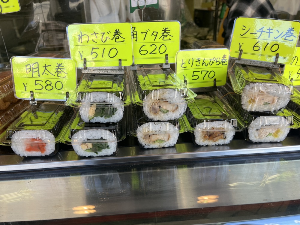 「とりきんぴら巻」をはじめ、「わさび巻」・「明太巻」・「角煮巻」など、お団子屋さんならではの個性豊かな太巻きがずらりと並んでいました。どれも一本一本が太く、手に取らなくてもその重量感が伝わってくるようです。