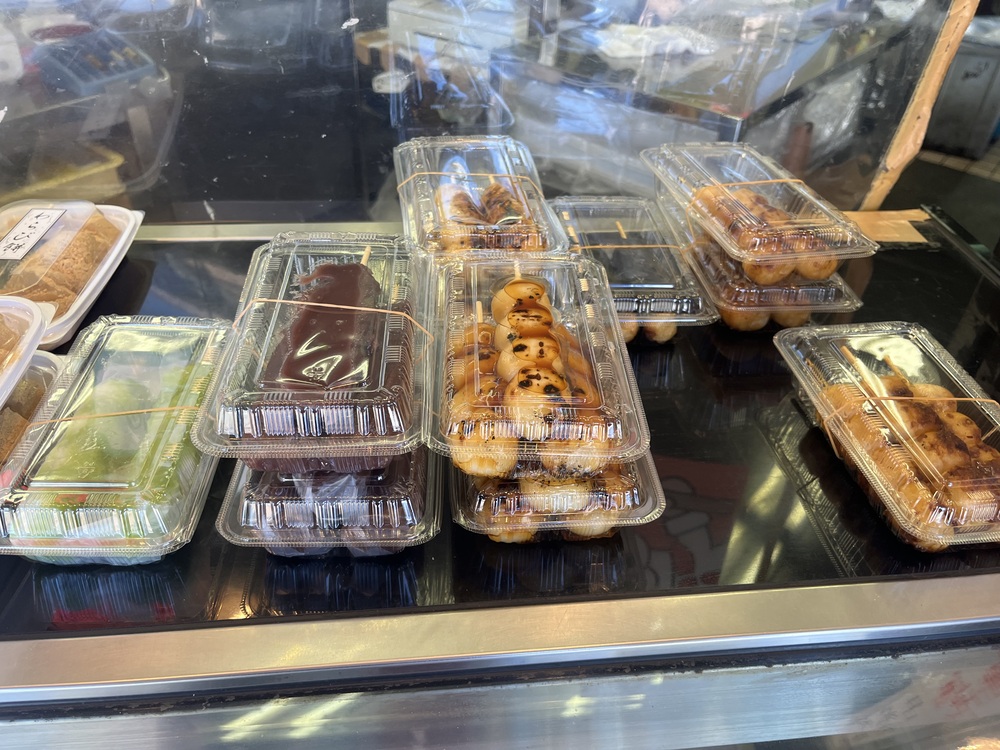 お昼を回っていたため、店頭のショーケースに並んでいる商品は少しずつ減ってきていましたが、それでも巻物やお団子の種類の多さには圧倒されます。