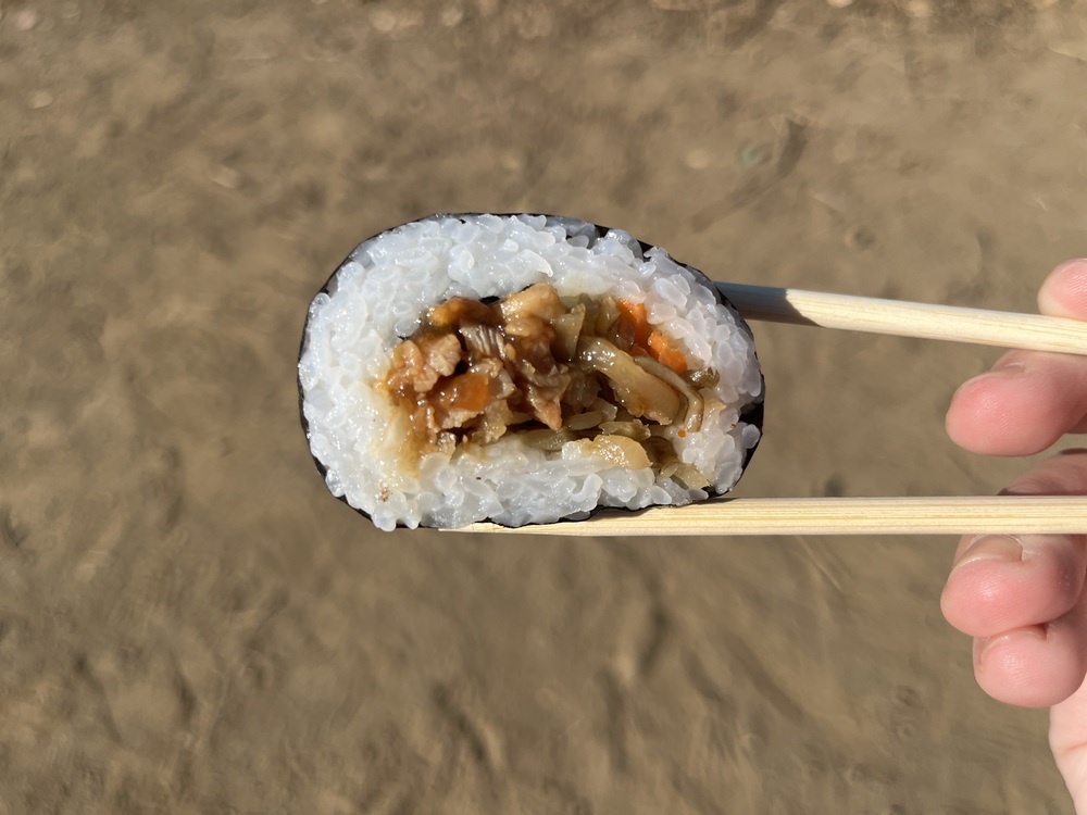 まずは、今回のメインディッシュである「とりきんぴら巻」からいただきます。お箸で一つ持ち上げると、その中身の密度に改めて驚かされます。