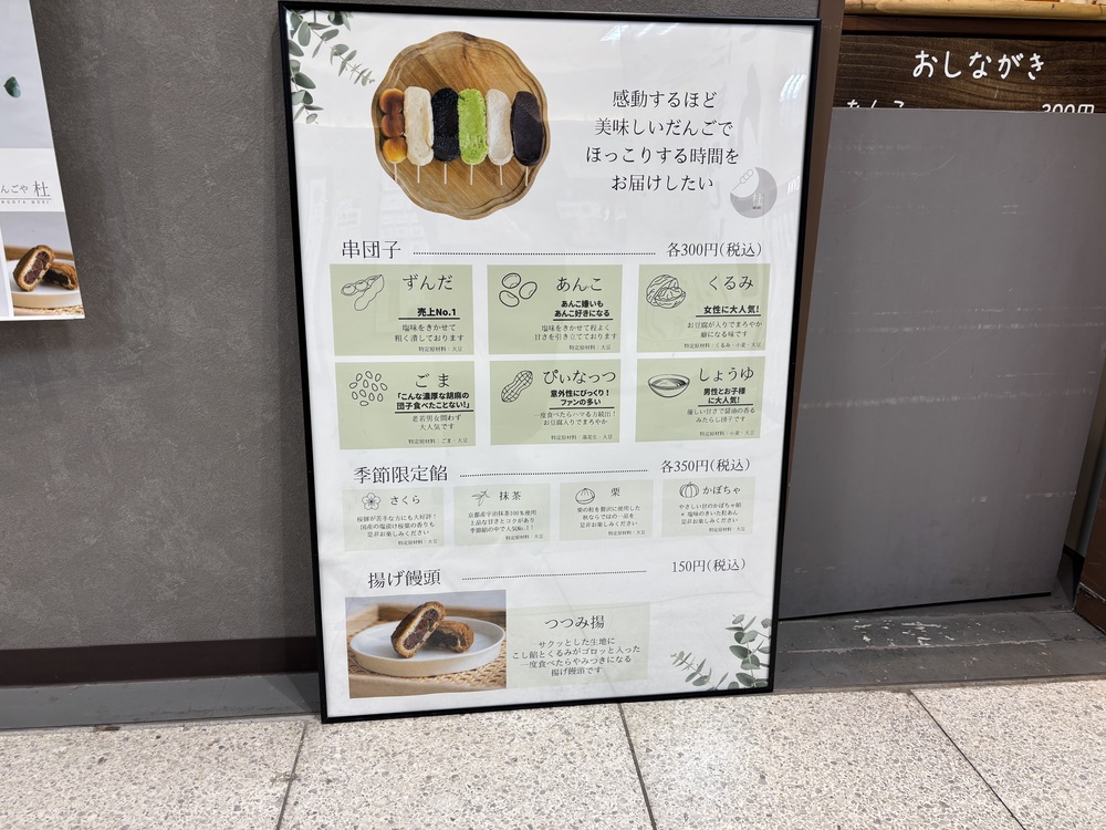 京王線府中駅の改札を出て徒歩約30秒。ぷらりと京王府中内に、たっぷりの餡がのったもちもちなお団子を楽しめるお店、「だんごや杜」があります。