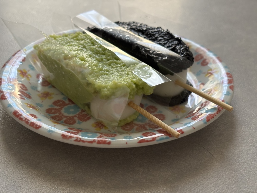 お店に足を運ぶたびにどの餡にしようかとても迷うのですが、今回は「ずんだ」と「ごま」の串団子を購入しました。